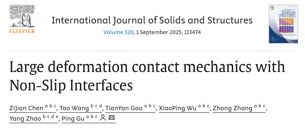近期,中国科学技术大学微纳米复合材料研究所张忠教授团队,在研究刚性凸起与半空间弹性体的无滑移-大变形方面,提出了一种新的理论框架。研究提出的无滑移-大变形模型,通过引入大变形系数θ,对Hertz理论进行了修正。研究表明,这种修正后的无滑移理论能够更准确地预测凸起与半空间弹性体大变形接触的作用力,尤其对于低泊松比弹性体,其预测结果与有限元分析和实验数据更为接近。此外,该理论还扩展到了考虑粘附力的情况,对JKR理论进行了大变形修正,揭示了在大变形条件下粘附力相对于接触压力可以忽略不计。这一研究不仅为理解软弹性体的大变形接触问题提供了新的理论工具,还为相关工程应用提供了重要的理论支持。相关研究以“Large deformation contact mechanics with Non-Slip Interfaces”为题,发表在固体力学领域TOP期刊International Journal of Solids and Structures上。