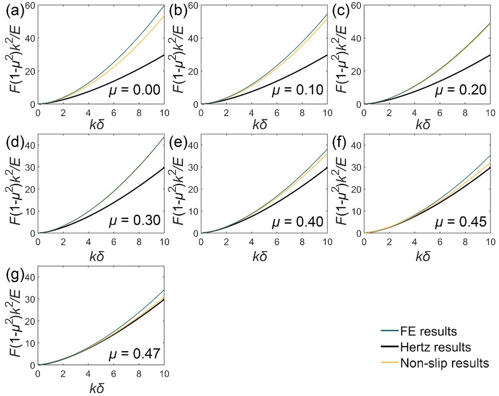 图2. 不同泊松比下有限元、Hertz和无滑移结果的F(1-μ2)k2/E-kδ曲线比较