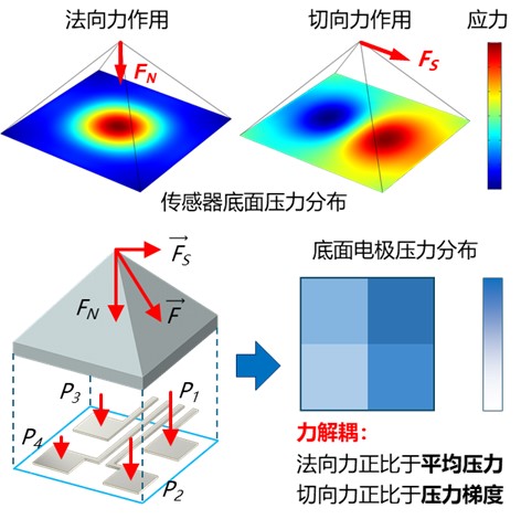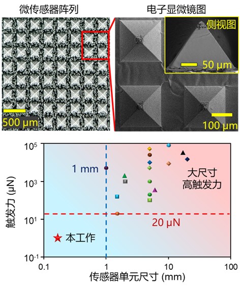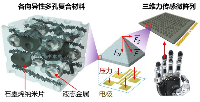 灵活的触觉传感器对于推进神经假体、人机交互和智能机器人至关重要。然而,实现高度灵敏的触觉传感,以区分正常力和面内力,尤其是在模仿人类手指的高分辨率多维触觉方面,仍然是一项挑战。在这里,我们提出了一种由石墨烯-液态金属复合材料制成的三轴力微传感器阵列。我们使用具有金字塔几何的微孔复合材料中的各向异性颗粒网络,通过多尺度结构实现正常-面内力解耦。 我们的方法在 500 kPa 线性范围内提供了 110 kPa-1 的卓越灵敏度(R2>0.998),力方向测量偏差小于 2°。传感器阵列通过自适应抓取未知物体实现了力解耦和滑移检测。我们的微传感器在尺寸和检测极限方面实现了质的飞跃,使微机械手和微机械人能够实现 3D 力觉感知,并解锁高级机械手的灵巧性。