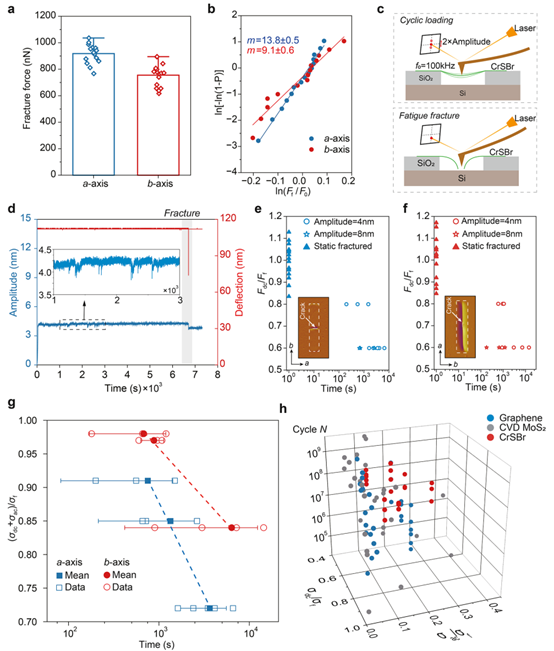 图4 基于AFM动态测试技术的疲劳实验研究。归一化应力下,b轴显示出更长的疲劳寿命,且与石墨烯,CVD-MoS2的疲劳寿命相当