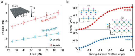 图5 CrSBr晶体沿a轴和b轴方向显示出不同的摩擦系数以及层间滑移能垒