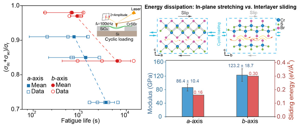 该工作从力学视角揭示了二维磁性半导体中层间剪切与面内键合协同主导的各向异性疲劳机理,构建了二维层状体系力学稳健性的统一理解框架,为未来在应变调控、自旋耦合及高可靠性器件中的设计提供了新思路。
