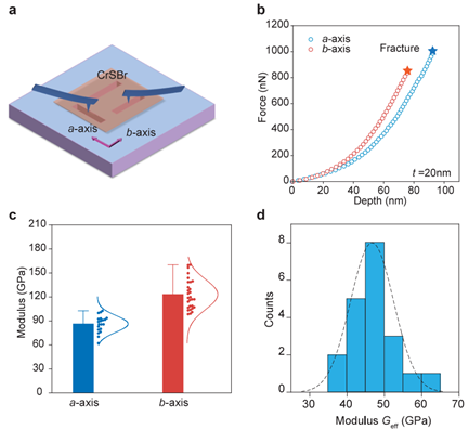 CrSBr晶体属于正交晶系(空间群 Pmmn),沿a、b轴存在明显结构与键合差异,导致其面内及层间力学行为均呈现强烈各向异性。研究团队通过角分辨AFM纳米压痕与接触共振测量,系统定量了CrSBr的多维弹性常数:其面内杨氏模量沿a、b轴分别约为86.4 GPa与123.2 GPa,剪切模量约46.7 GPa,展现出高达1.43的弹性各向异性比;面外杨氏模量约为54 GPa,显著高于石墨烯与h-BN,反映出层间Br-Br锁定作用下的强耦合特征。这种面内-层间耦合的双重各向异性,为其独特的能量耗散与疲劳响应奠定了基础。