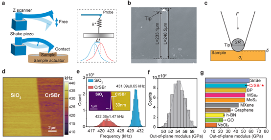 图3 CR-AFM测量CrSBr晶体的面外模量的原理以及测量结果,并与已经报道的代表性二维材料结果对比