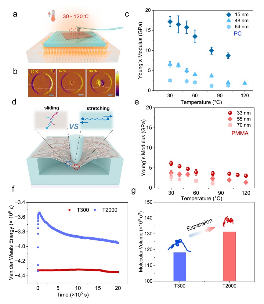 变温力学测试表明,当薄膜厚度降至约 15 nm 时,其弹性模量对温度的敏感性显著增强。升温削弱了分子间相互作用,使纳米受限薄膜的变形机制由单链拉伸逐渐转向链间滑移,从而加速力学软化。该效应具有明确的结构依赖性,表现为主链刚性更高的聚合物(如 PC)表现出更陡峭的模量衰减,这是因为刚性主链堆积较为松散,且在热扰动下构象坍缩更剧烈,凸显了分子链刚性在纳米尺度热–力耦合响应中的主导作用。