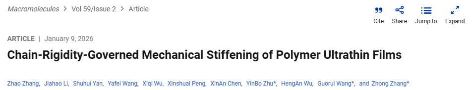 研究团队围绕“分子链刚性如何主导高分子纳米薄膜力学响应”这一核心问题,系统研究了不同化学结构高分子超薄膜的弹性力学行为。通过AFM纳米压痕测试、单分子力谱实验和分子动力学模拟的协同分析,指出当薄膜厚度接近或低于分子链特征尺度时,载荷传递机制会从链间滑移主导转变为单链拉伸主导,其力学硬化程度由分子链本征刚性所控制。变温力学测试进一步揭示了分子链拉伸与分子间相互作用的竞争关系,并深入解析了熵与焓对单链刚性的贡献。相关成果以“Chain-Rigidity-Governed Mechanical Stiffening of Polymer Ultrathin Films”为题发表于 Macromolecules上。