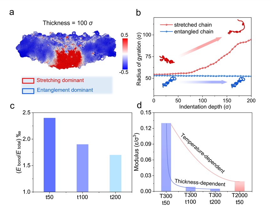 分子动力学模拟揭示,在纳米受限条件下,薄膜内部承载逐渐由链间相互作用转向单链拉伸贡献。随着厚度降低,参与承载的拉伸链比例显著增加,使主链变形在整体力学响应中占据主导地位。与柔性链PMMA相比,具有芳环结构的PC主链刚性更高,因此在相同受限条件下表现出更强的力学强化。