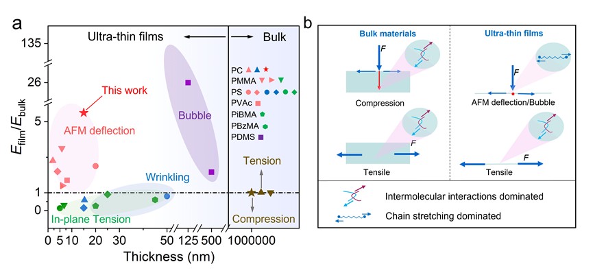 随着柔性电子、高性能涂层及纳米机电系统的飞速发展,厚度低于100纳米的超薄聚合物薄膜已成为不可或缺的核心组件。然而,当高分子薄膜厚度降低至几十纳米甚至单链尺度,其力学行为常显著偏离体相特性,并在不同实验方法下呈现出“越薄越硬”或“越薄越软”的相互矛盾结论。研究团队早期在Macromolecules [2022, 55, 1248-1259]报道中揭示了自由悬浮高分子纳米薄膜的力学硬化现象,并指出高分子链在纳米尺度力学响应中的关键作用。本次工作在此基础上进一步深化与拓展,将分子链刚度引入为决定性物理量,建立起可统一解释不同实验观测的力学框架,不仅阐明了高分子纳米薄膜力学测量领域长久以来存在的争议,还为未来精准设计下一代高性能柔性纳米材料指明了方向。